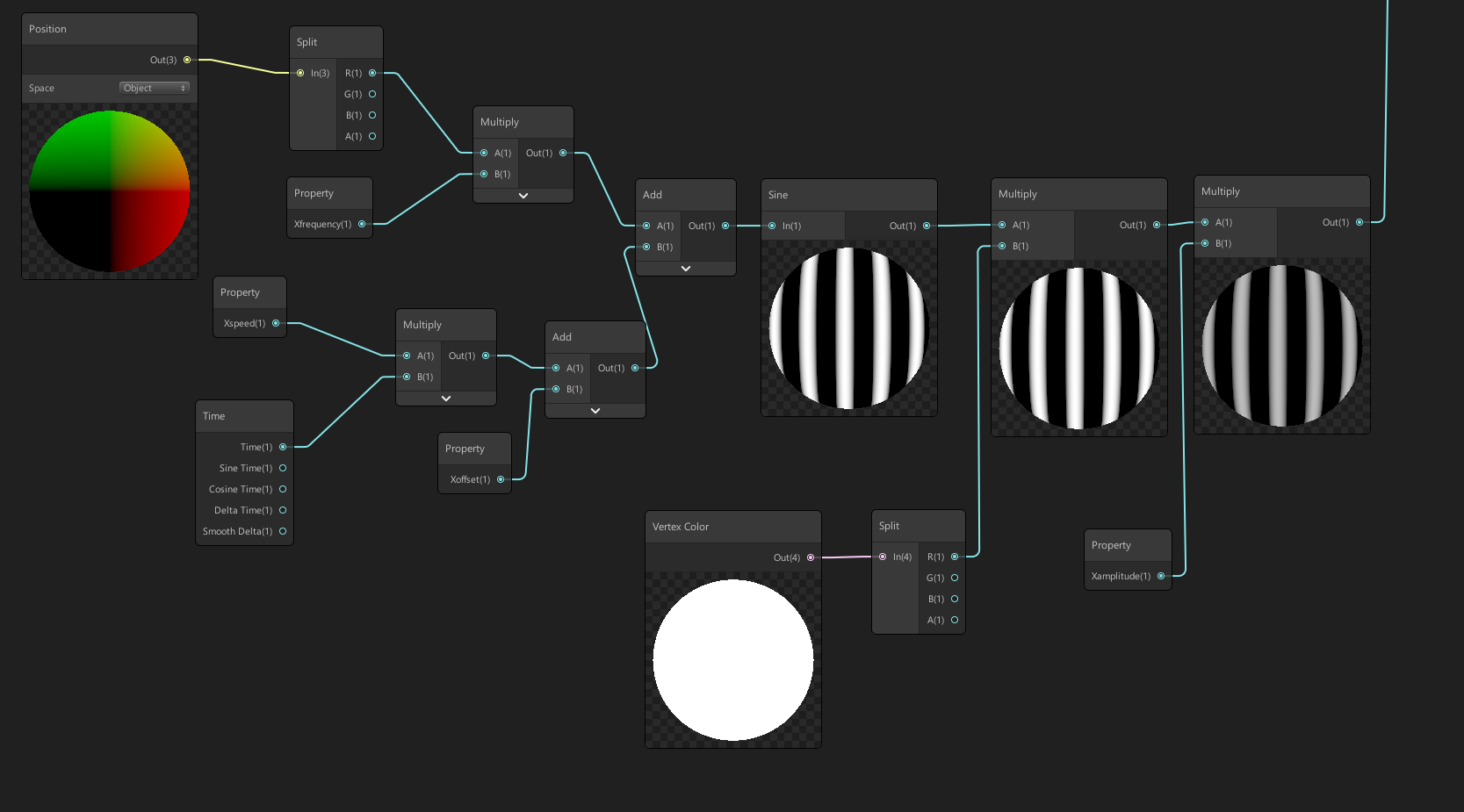 Now in shader graph I used the position parameter to displace the vertex with sinusoidal waves. I have an X and Y sine wave. Here you can see the nodes I use to make the X wave: